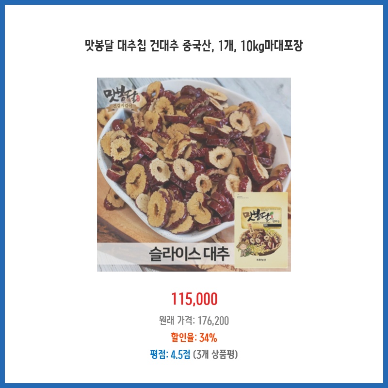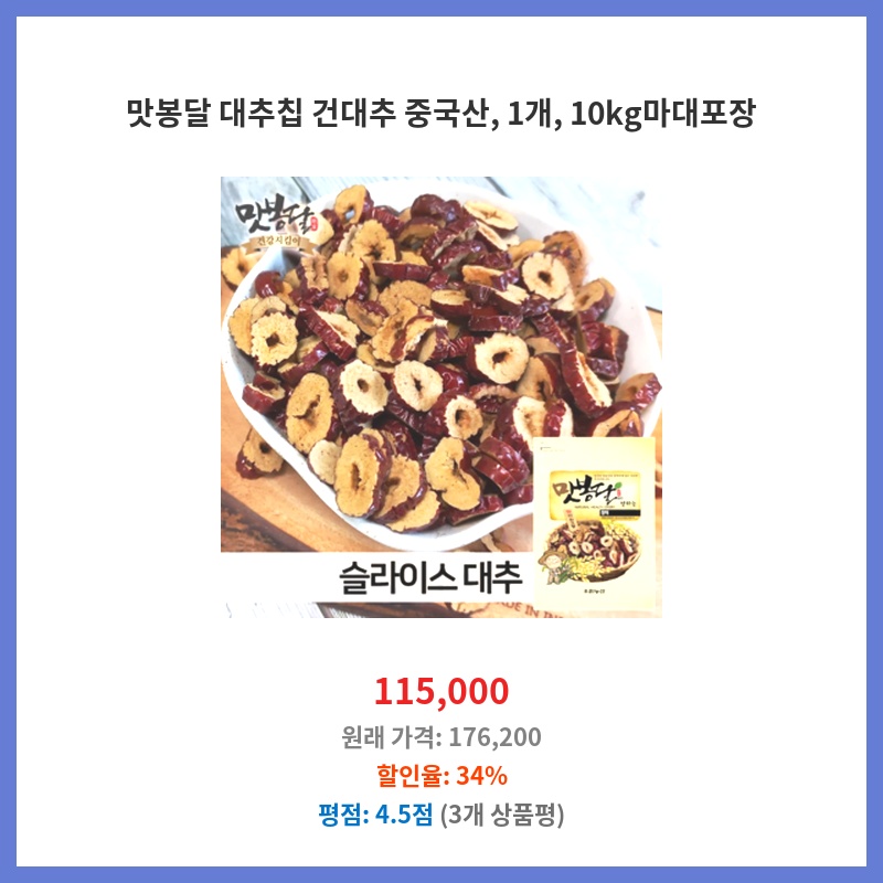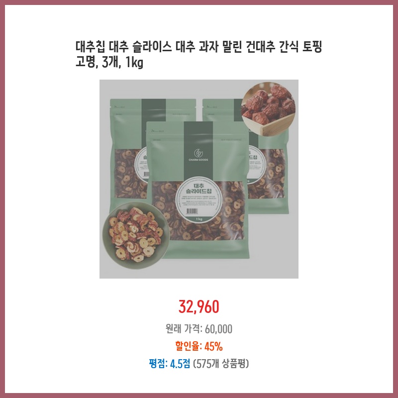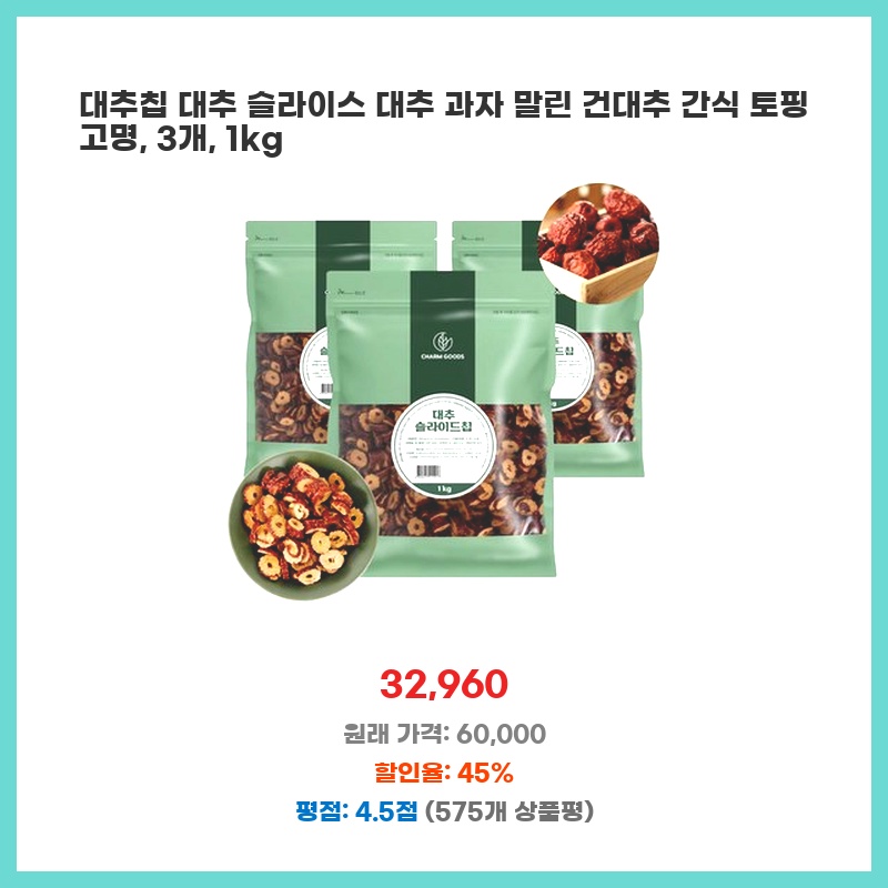 대추칩 대추 슬라이스 대추 과자 말린 건대추 간식 토핑 고명, 3개, 1kg