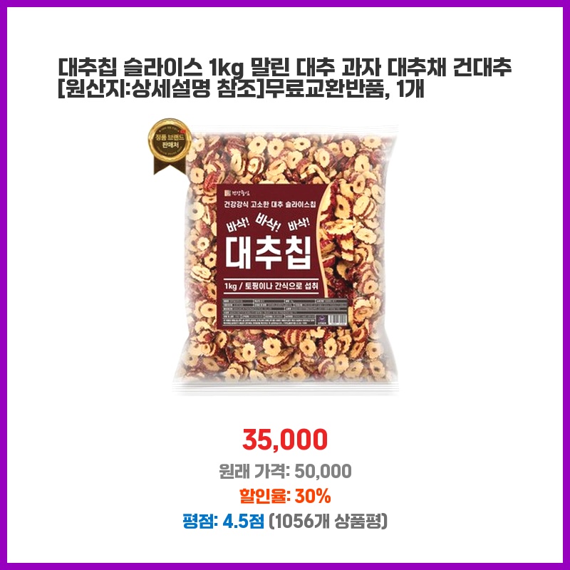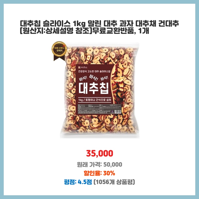 대추칩 슬라이스 1kg 말린 대추 과자 대추채 건대추 [원산지:상세설명 참조]무료교환반품, 1개
